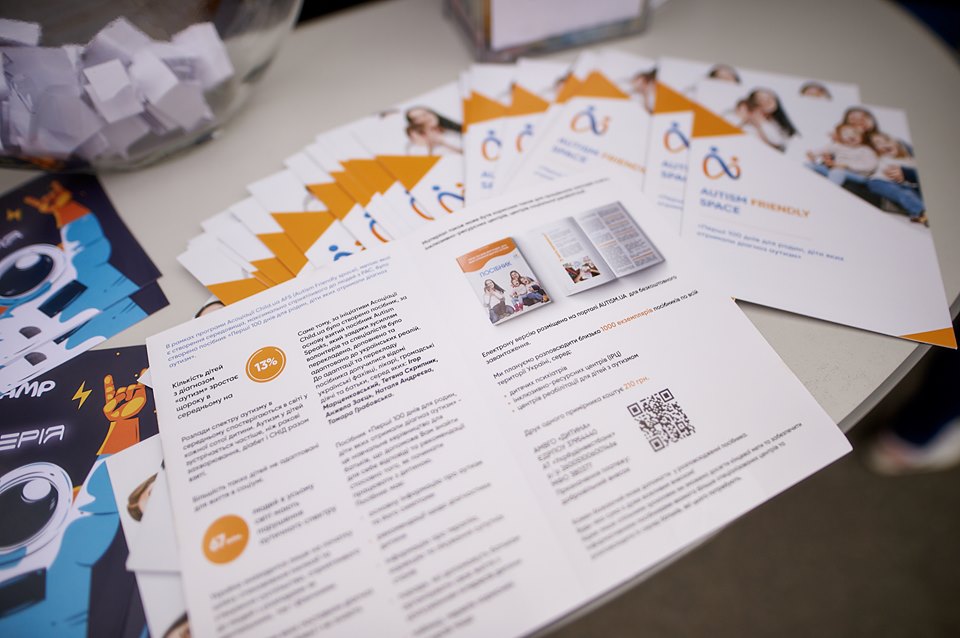 Розробка буклетів, пам’яток, відео тощо. Завдяки зусиллям волонтерів та українських фахівців ми створили посібник «Перші 100 днів для родин, діти яких отримали діагноз аутизм». Він рекомендований Вченою радою ДУ «НДІП МОЗ України» в якості посібника для батьків дітей з розладами загального розвитку